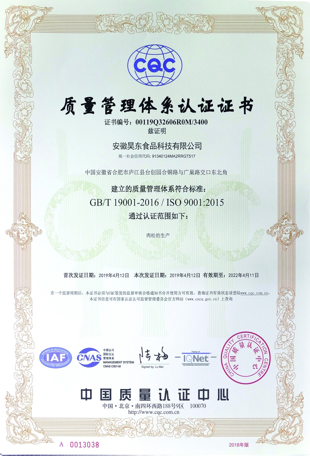 • 食品安全管理體系認(rèn)證證書